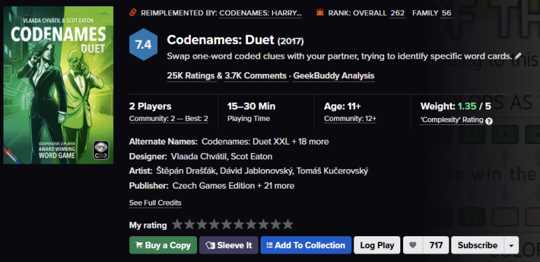 듀엣이란 말 그대로 협력 게임이며 파티게임의 정석 중 하나인 코드네임의 시리즈 중 하나이나,