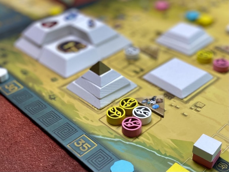 멘네페르는 자칫 매우 복잡해질 수 있었던 게임을 직관적으로 쉽게 파악할 수 있게 잘 만들었다고 생각합니다. 일꾼을 가져다 놓으면서 타일에 그려진 액션, 일꾼을 옆으로 옮기면서 해당 트랙 액션, 타일을 가지고 오면서 그 옆 라인에 보이는 혜택 받고 무늬가 맞으면 또 다른 트랙 올리기.